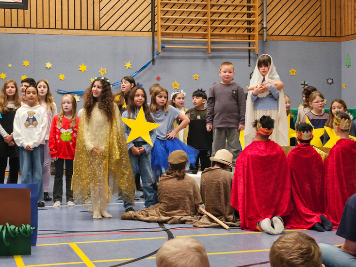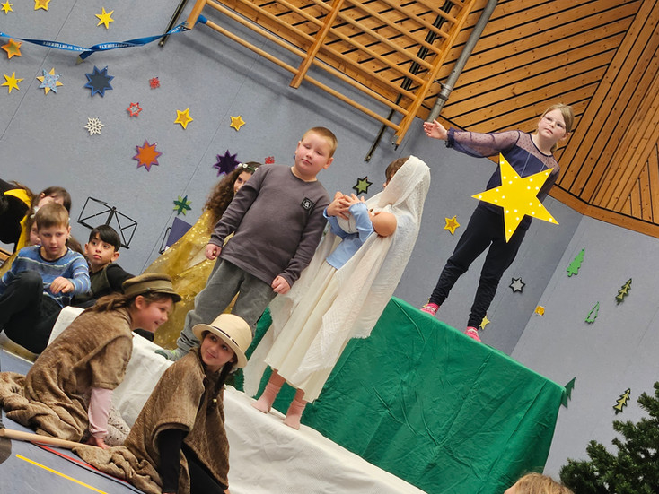 Höhepunkt der diesjährigen Weihnachtsfeier war das Theaterstück "Der kleine Weihnachtsstern" der Klassen 2a und 2b, welches die kleinen Schauspieler*innen unter der Leitung von Frau Kipper und mit Unterstützung des Chors aufführten. Mirna, Eslem und Mia aus der Klasse 4b sangen wunderschöne Solos bzw. Duette.